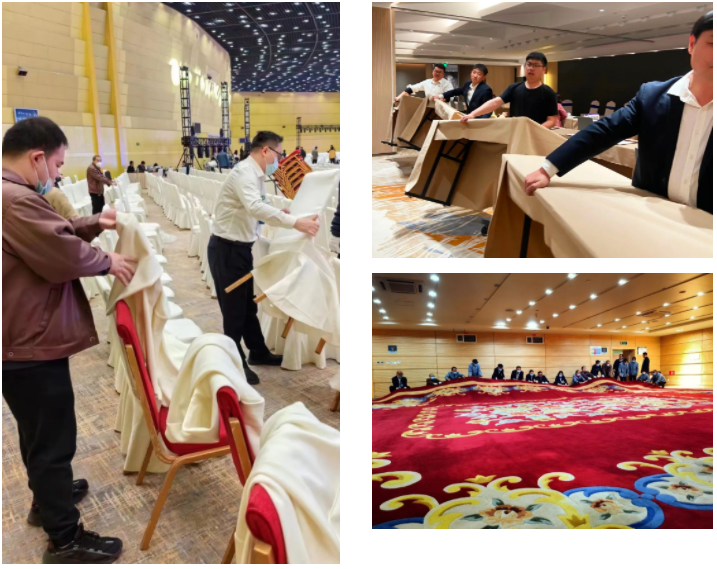 開幕式暨主論壇結(jié)束后,按照主辦方提出的要求,需要在短時間內(nèi)完成400余張桌子、3000余把椅子以及軒轅堂和9個會議室的翻場規(guī)整任務(wù),桌椅需要重新調(diào)整,間距需要重新測量,臺裙臺呢需要重新布置...面對時間緊、任務(wù)重的現(xiàn)實情況,公司科學組織、統(tǒng)一調(diào)配,各部門員工積極響應,迅速調(diào)動增加近五十名員工全力參與現(xiàn)場保障,通過大家的努力及各部門之間的通力配合,三個小時精準高效地完成了各項工作。此次大規(guī)模轉(zhuǎn)場按時按量的完成,充分體現(xiàn)了會展中心員工隊伍的凝聚力和合作意識,展現(xiàn)了高標準、高質(zhì)量的服務(wù)保障水平。