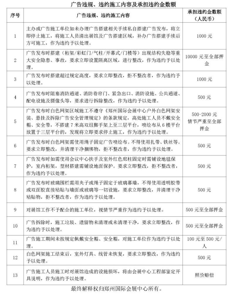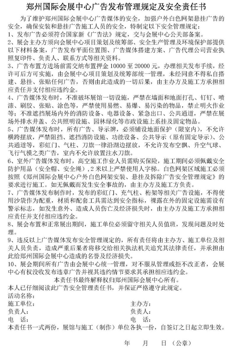 鄭州國際會展中心廣告發(fā)布管理規(guī)定及安全責(zé)任書