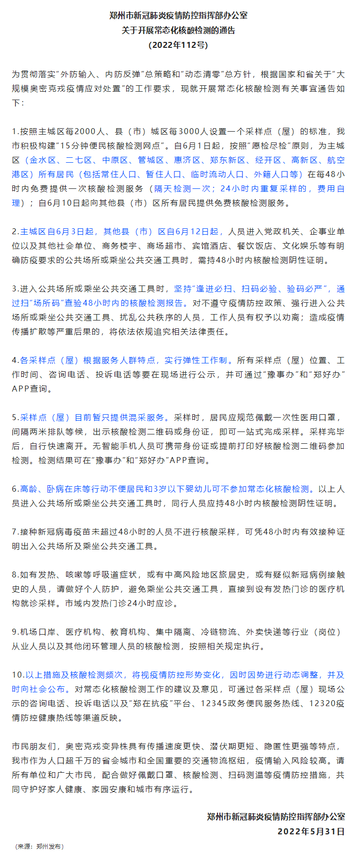 【轉載】鄭州市新冠肺炎疫情防控指揮部辦公室關于開展常態(tài)化核酸檢測的通告