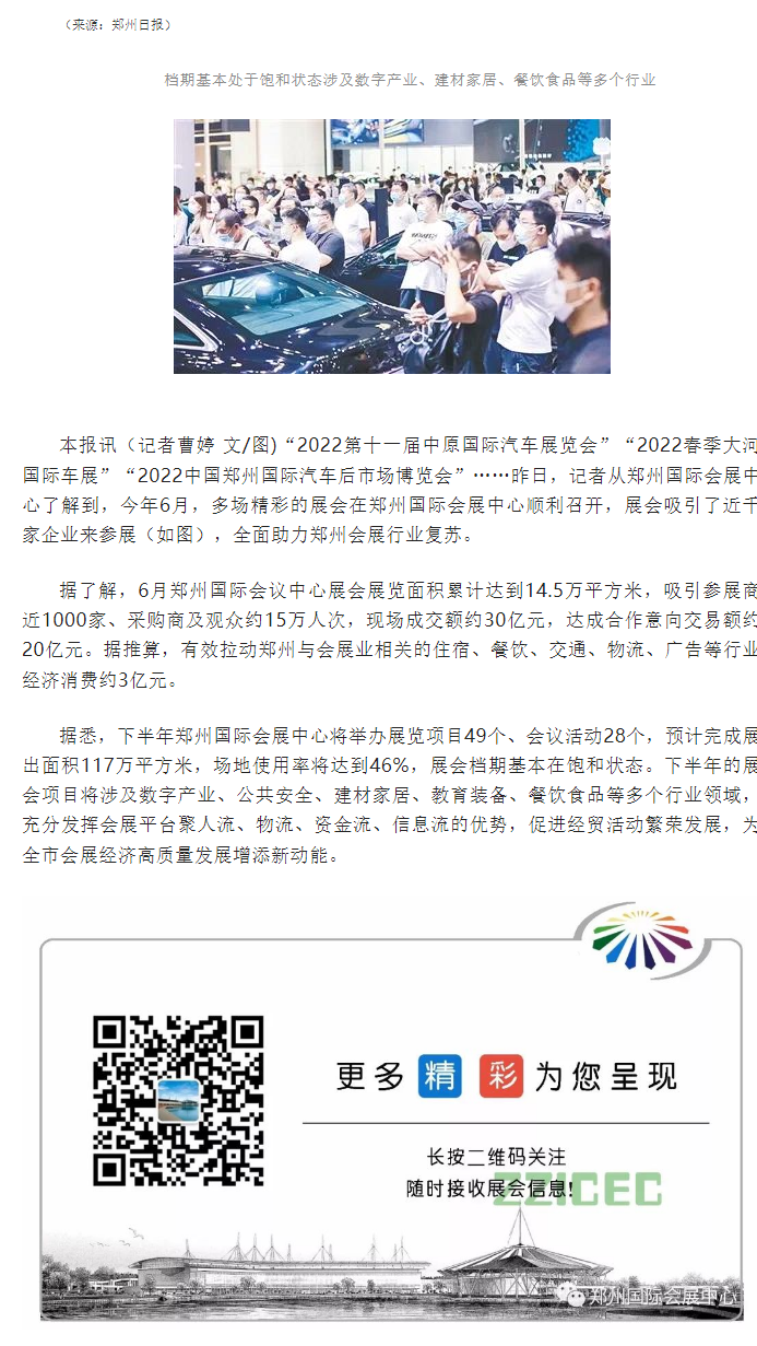 首頁新聞中心展會新聞文章詳情 文章詳情 【轉載】下半年鄭州會展多多客似云來 據(jù)悉,下半年鄭州國際會展中心將舉辦展覽項目49個、會議活動28個,預計完成展出面積117萬平方米,場地使用率將達到46%,展會檔期基本在飽和狀態(tài)。下半年的展會項目將涉及數(shù)字產業(yè)、公共安全、建材家居、教育裝備、餐飲食品等多個行業(yè)領域,充分發(fā)揮會展平臺聚人流、物流、資金流、信息流的優(yōu)勢,促進經(jīng)貿活動繁榮發(fā)展,為全市會展經(jīng)濟高質量發(fā)展增添新動能。