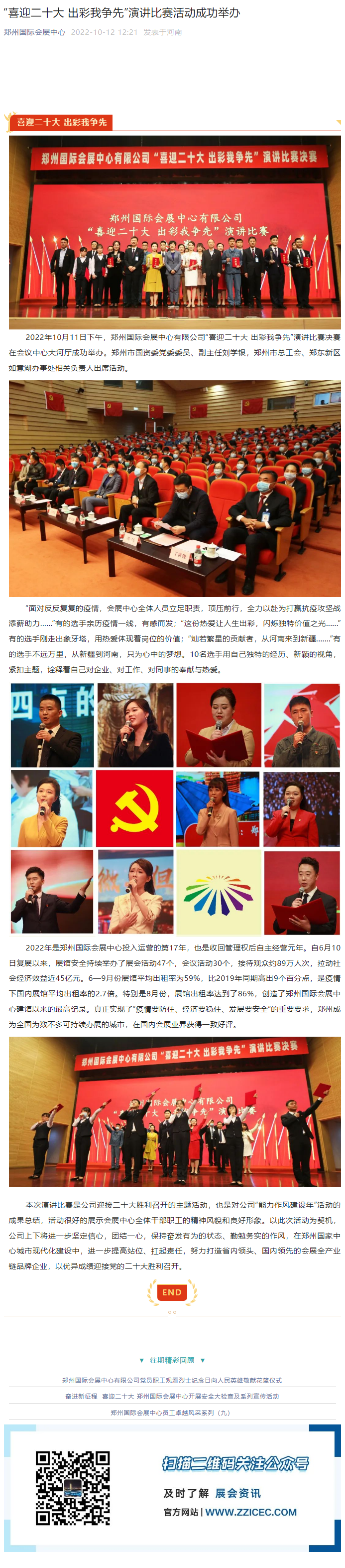 2022年10月11日下午,鄭州國(guó)際會(huì)展中心有限公司“喜迎二十大 出彩我爭(zhēng)先”演講比賽決賽在會(huì)議中心大河廳成功舉辦。鄭州市國(guó)資委黨委委員、副主任劉學(xué)銀,鄭州市總工會(huì)、鄭東新區(qū)如意湖辦事處相關(guān)負(fù)責(zé)人出席活動(dòng)。