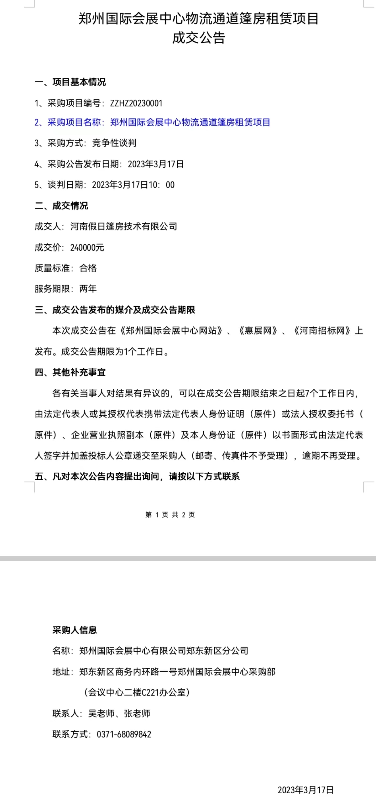 鄭州國際會展中心物流通道篷房租賃項(xiàng)目 成交公告