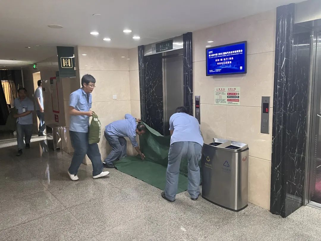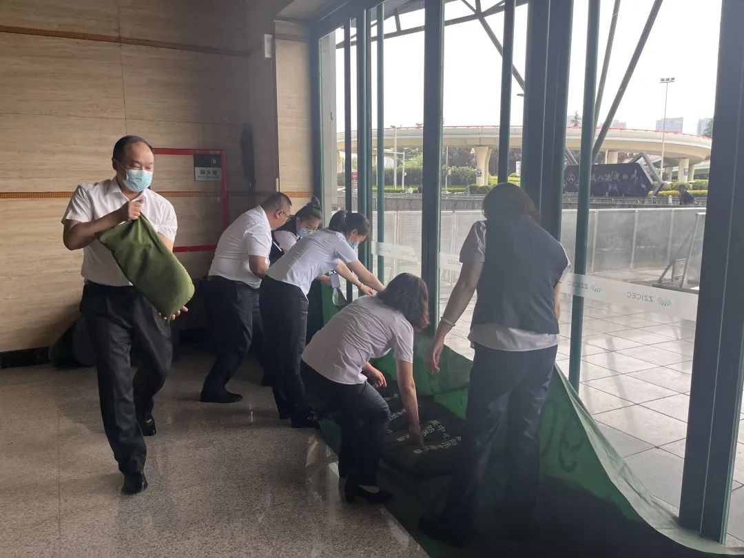 氣象局發(fā)布暴雨黃色預(yù)警,公司啟動(dòng)Ⅲ級(jí)黃色應(yīng)急響應(yīng),各部門按照預(yù)案進(jìn)行沙袋擺放,會(huì)議中心和展覽中心滴漏點(diǎn)用防汛桶接水,地面水漬安排保潔人員清理。